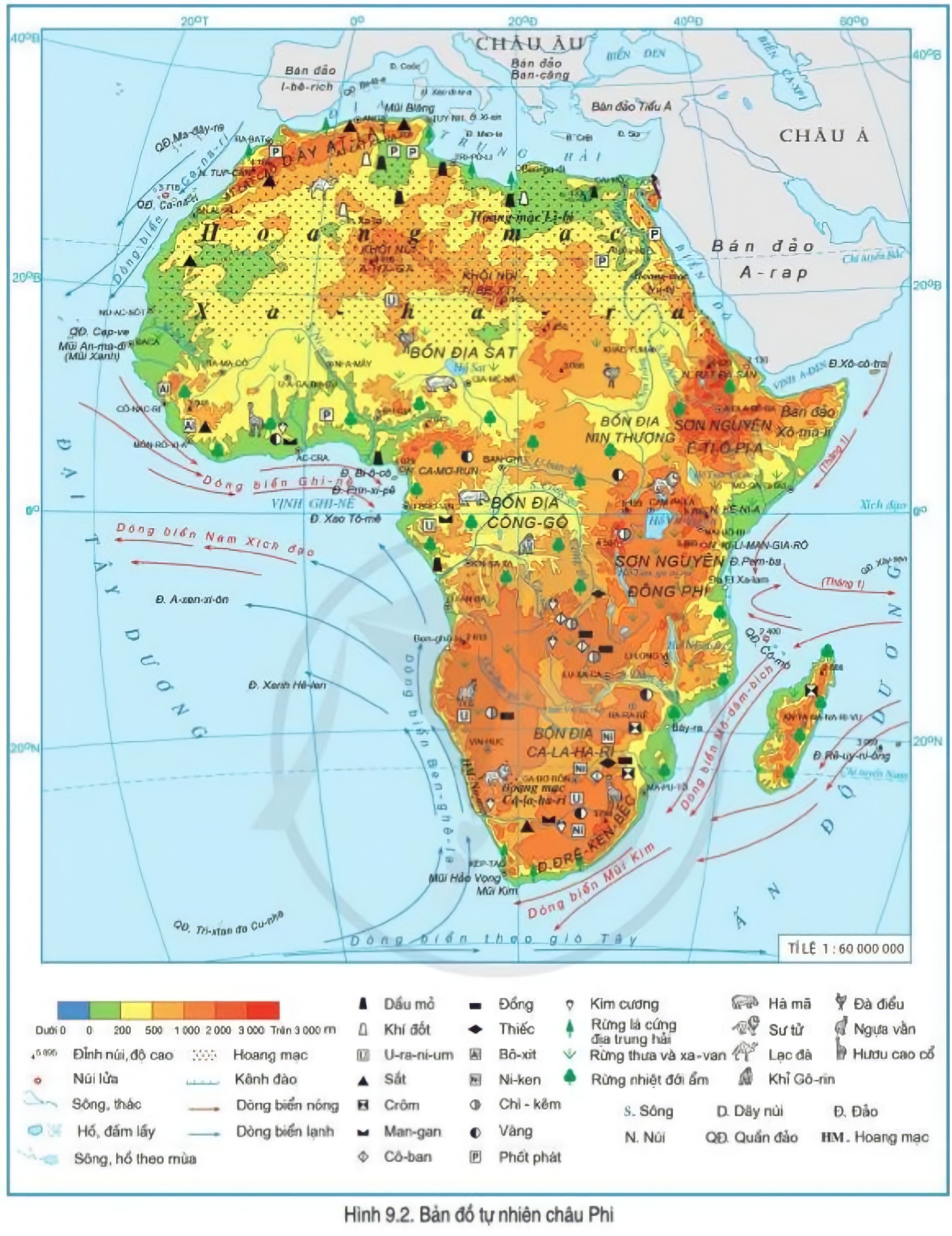 – Xác định các sơn nguyên, bồn địa, các dãy núi của châu Phi.