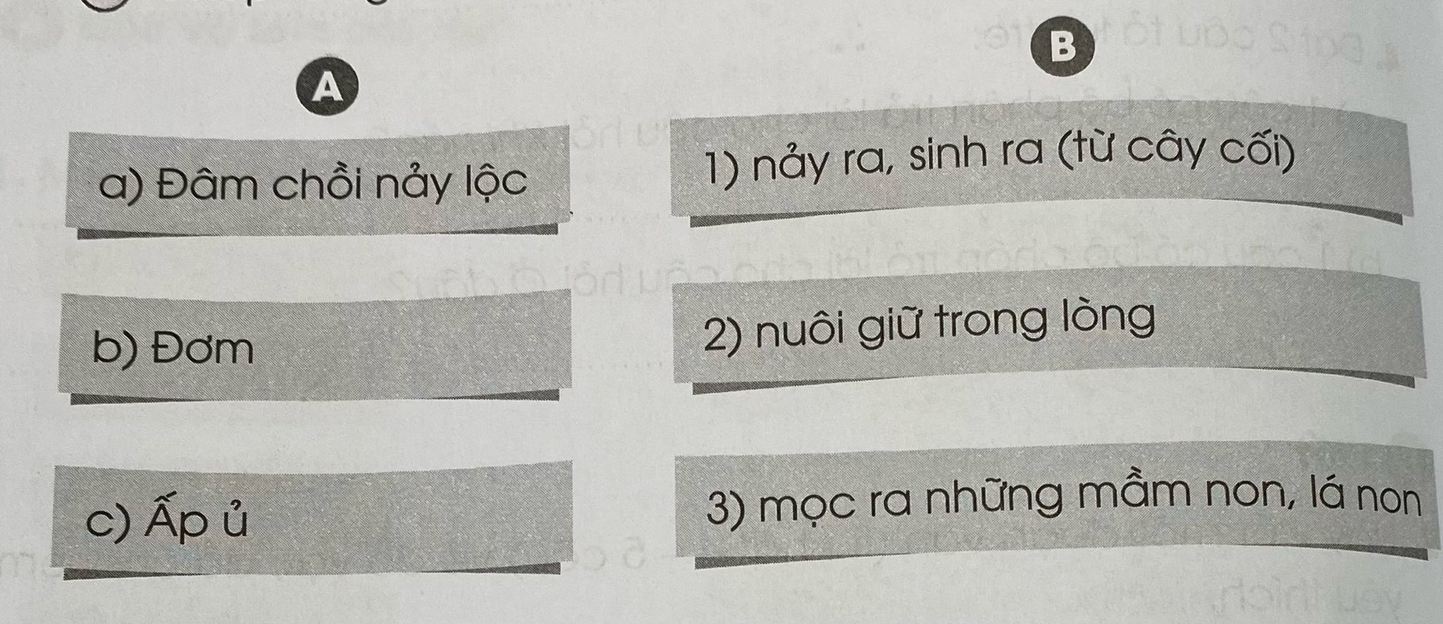 Ghép từ ngữ ở bên A với nghĩa phù hợp ở bên B: