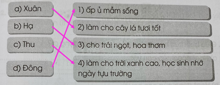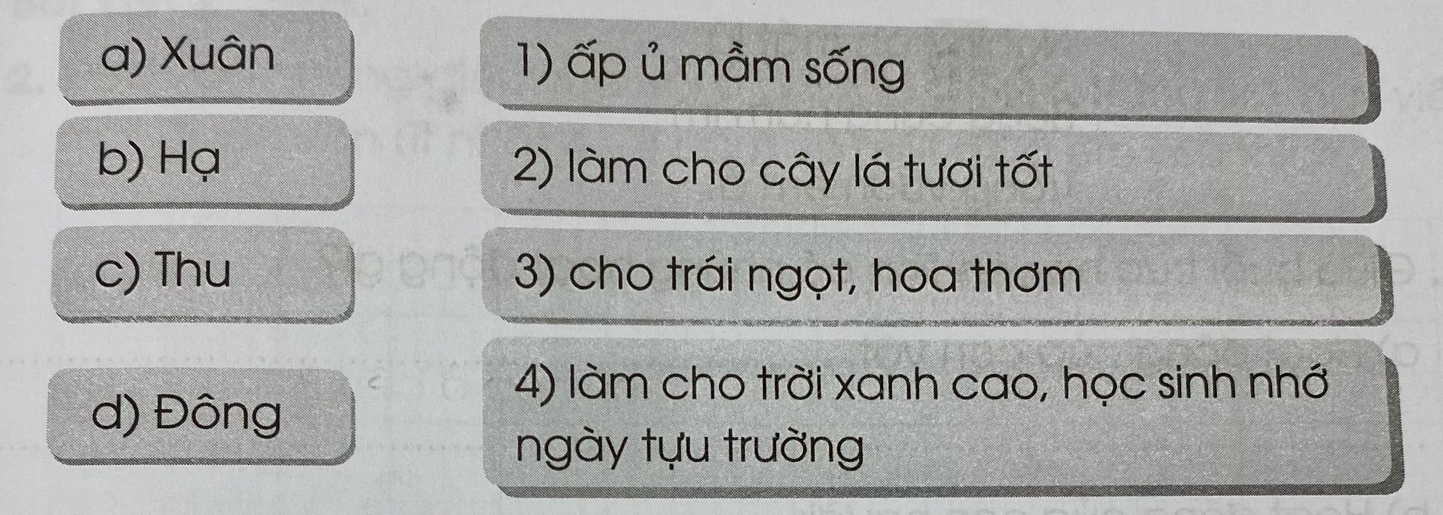 Ghép từ ngữ ở bên A với nghĩa phù hợp ở bên B. Theo lời các nàng tiên, mỗi mùa có gì hay? Viết tiếp câu trả lời. Theo lời bà Đất, mỗi người đều có ích, đều đáng yêu như thế nào. Trả lời câu hỏi. Điền thêm dấu phẩu vào chỗ thích hợp trong 2 câu in nghiêng.
