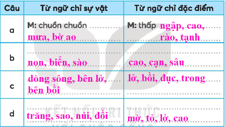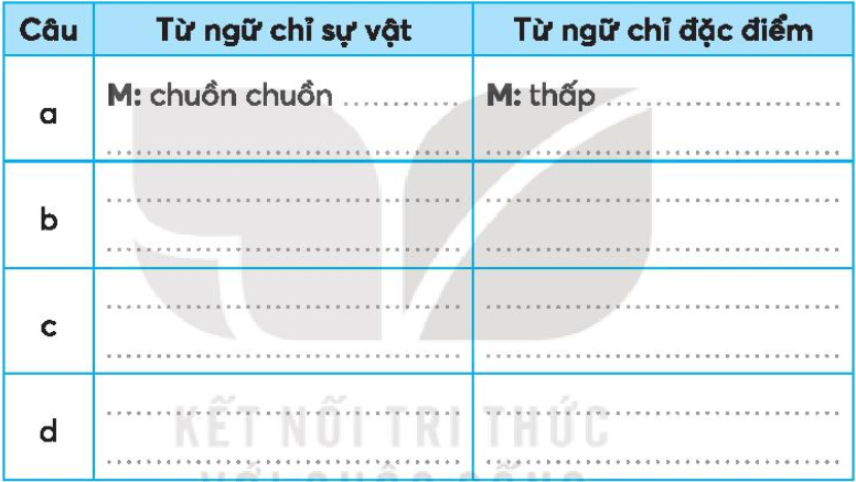 Chọn từ ngữ chỉ đặc điểm trong ngoặc đơn điền vào chỗ trống.