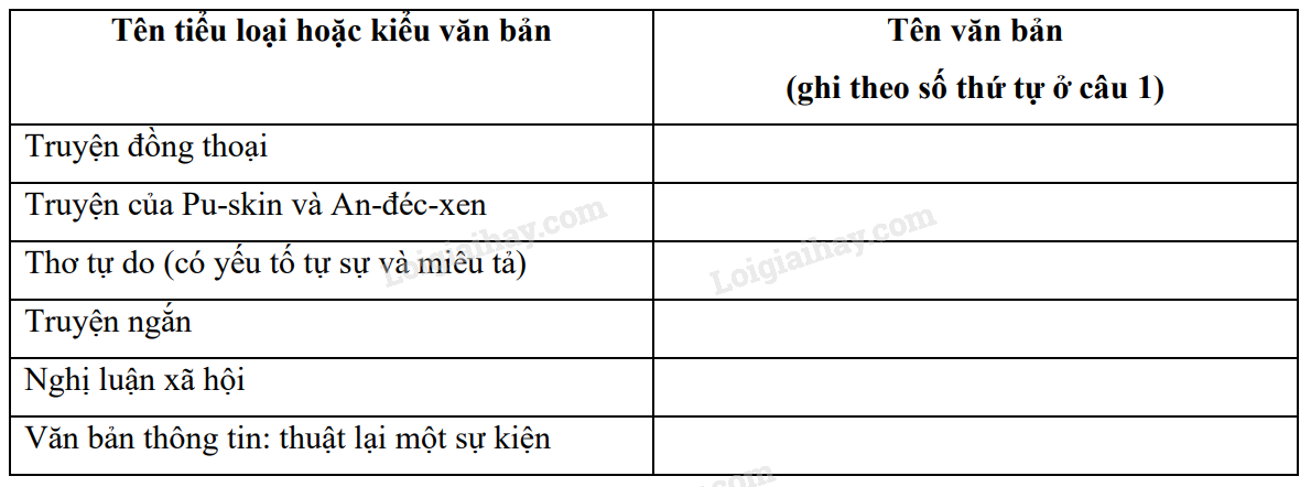 Điền các tên văn bản ở câu 1 vào bảng sau cho phù hợp với các tiêu loại và kiểu văn bản ở cột bên trái.