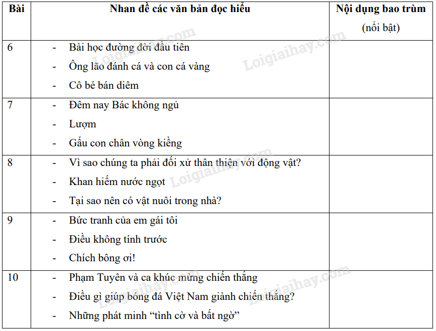 Chỉ ra nội dung bao trùm lên các văn bản đọc hiểu của các bài học (từ Bài 6 đến Bài 10) trong SGK Ngữ văn 6, tập hai.