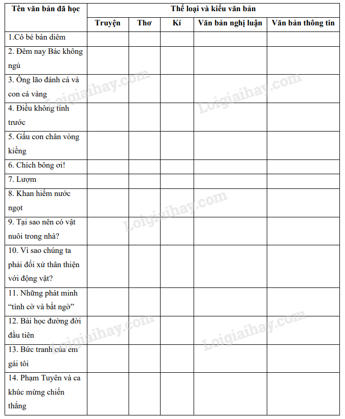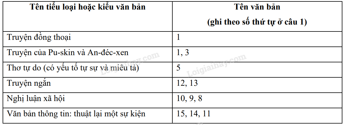 Điền các tên văn bản ở câu 1 vào bảng sau cho phù hợp với các tiêu loại và kiểu văn bản ở cột bên trái.