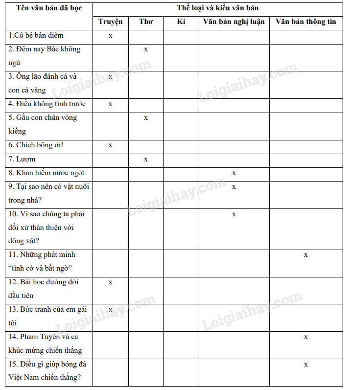 Đánh đấu X vào ô trống ở cột thể loại và kiểu văn bản trong bảng sau cho phù hợp với các văn bản đọc hiểu ở SGK Ngữ văn 6, tập hai:
