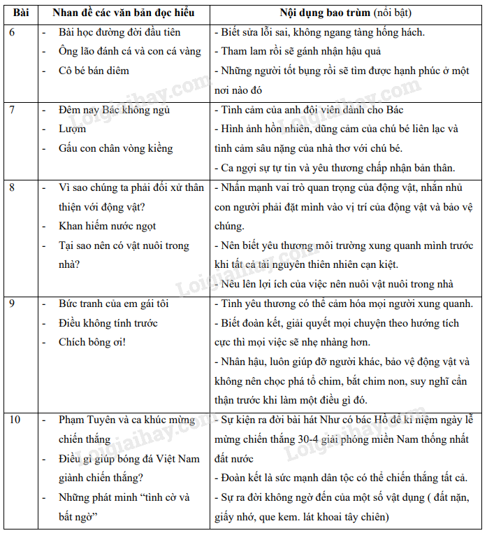 Chỉ ra nội dung bao trùm lên các văn bản đọc hiểu của các bài học (từ Bài 6 đến Bài 10) trong SGK Ngữ văn 6, tập hai.
