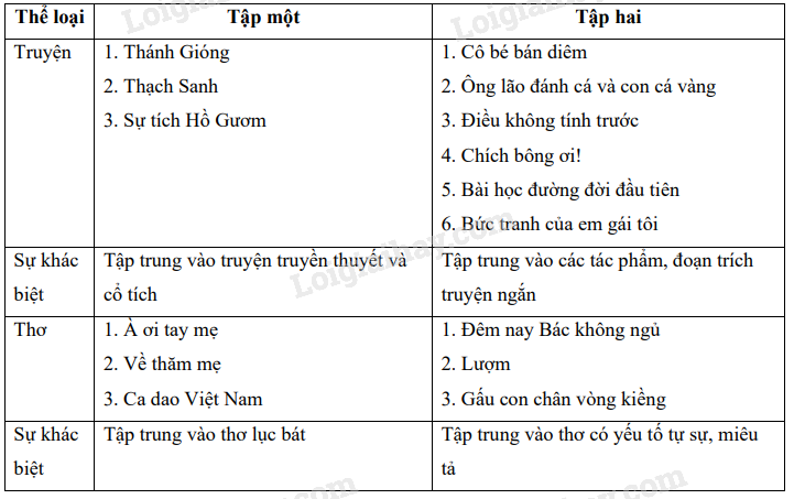 (Câu 4, SGK) Thống kê các văn bản văn học (truyện, thơ) đã học ở hai tập sách Ngữ văn; từ đó, nhận xét sự khác biệt về đặc điểm hình thức của mỗi thể loại ở hai tập sách (Gợi ý: Về thể loại thơ, sự khác biệt về đặc điểm hình thức là Ngữ văn 6, tập một tập trung vào thơ lục bát; Ngữ văn 6, tập hai tập trung vào thơ có yếu tố tự sự, miêu tả).
