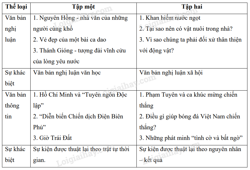 Câu 5, SGK) Thống kê các văn bản nghị luận và văn bản thông tin đã học ở hai tập sách Ngữ văn 6 từ đó, nhận xét sự khác biệt về nội dung đề tài của mỗi loại văn bản ở hai tập sách (Gợi ý: Sự khác biệt về nội dung đề tài của văn bản nghị luận là Ngữ văn 6, tập một hướng dẫn học về nghị luận văn học; Ngữ văn 6, tập hai hướng dẫn học về nghị luận xã hội.).