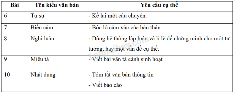 (Câu 6, SGK) Thống kê tên các kiểu văn bản đã được luyện viết trong sách Ngữ văn 6, tập hai.