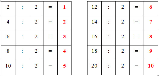 Nhẩm lại bảng chia 2 rồi điền số thích hợp vào ô trống.
