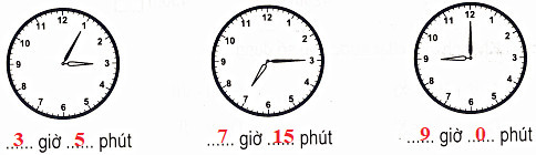 Xác định kim giờ và kim phút đang chỉ vào số bao nhiêu rồi đọc giờ tương ứng.