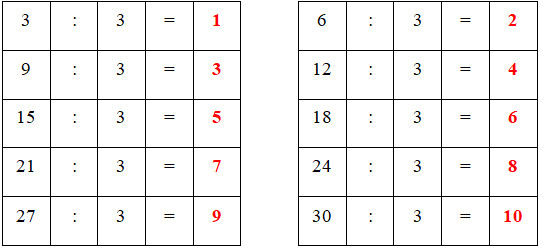 Nhẩm lại bảng chia 3 rồi điền kết quả vào ô trống.