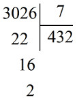 A. 3026 : 7 = 432 (dư 1)                              B. 3026 : 7 = 432 (dư 2)