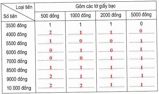 Lưu ý: có nhiều cách lấy số tiền bằng nhiều loại tờ giấy bạc khác nhau, học sinh có thể tùy chọn cách đúng.