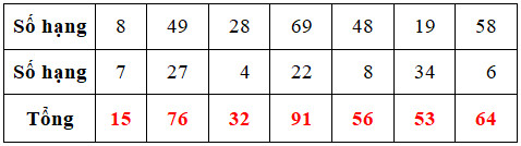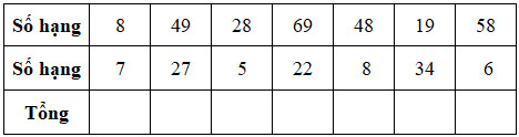 Cộng hai số hạng rồi điền kết quả vào ô trống.