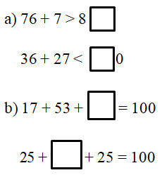 b) Tính nhẩm phép cộng các số đã biết ở vế trái, rồi điền số thích hợp vào ô trống sao cho tổng của kết quả vừa tìm được và số cần điền là 100.