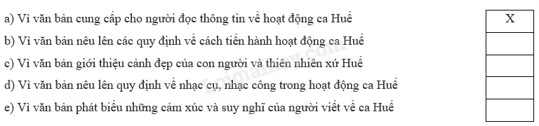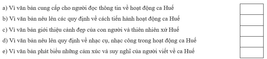Đánh dấu X vào các phương án trả lời đúng cho câu hỏi: “Vì sao văn bản Ca Huế là văn bản thông tin?”: