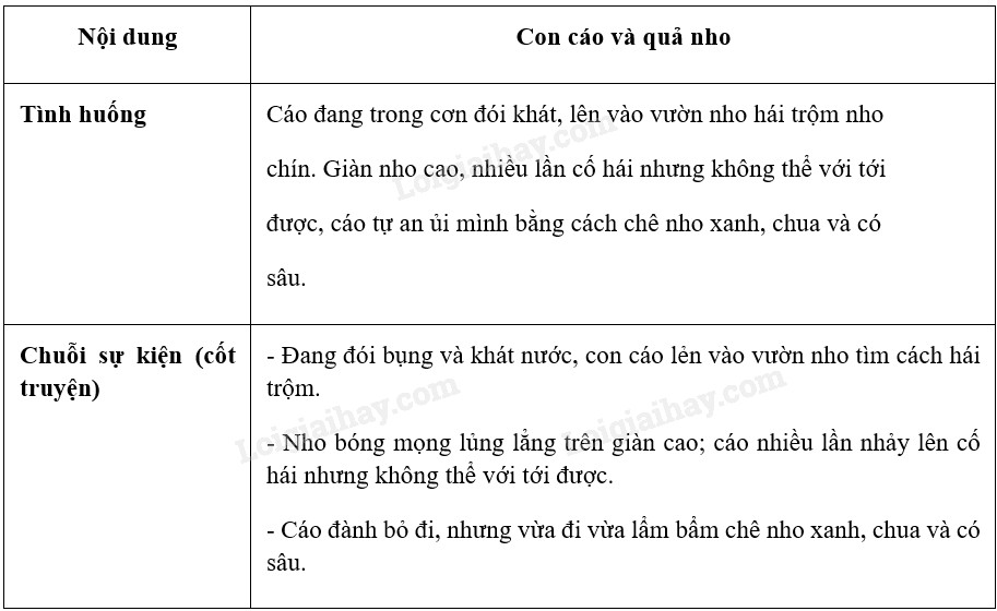 a. Tóm tắt tình huống truyện, chuỗi sự kiện (cốt truyện) truyện Con cáo và quả nho và hoàn thành theo mẫu bảng đưới đây. Dựa vào các bài tập mà em đã thực hiện, cho biết: việc tóm tắt tình huống truyện với tóm tắt chuỗi sự kiện (cốt truyện) khác nhau như thế nào?