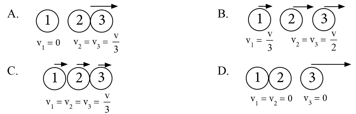 Hai viên bi giống hệt nhau tiếp xúc với nhau và nằm trên mặt bàn không có ma sát thì bị một viên bi khác có cùng khối lượng đang chuyển động với vận tốc v theo đường thẳng qua tâm của hai viên bi tới va chạm. Nếu va chạm là đàn hồi, thì hình nào sau đây là kết quả có thể xảy ra sau va chạm?