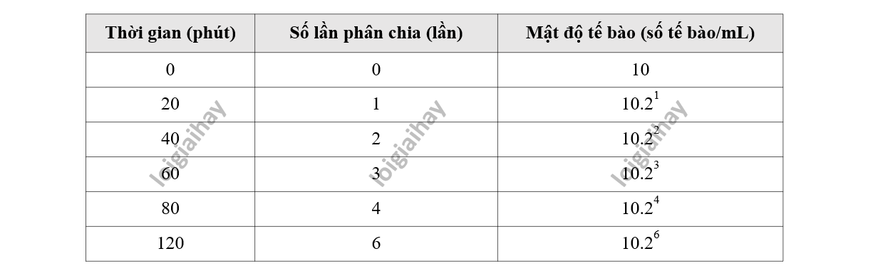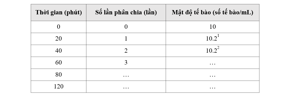 a) Hãy điền tiếp vào bảng sau đây: (1) số lần phân chia và (2) mật độ tế bào của quần thể vi khuẩn E. coli sau mỗi khoảng thời gian nuôi cấy thích hợp của pha lũy thừa.