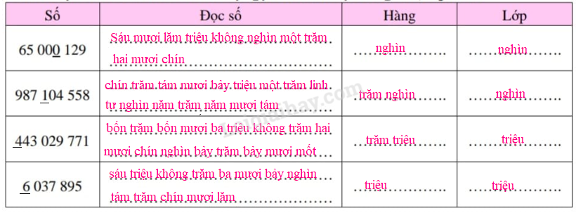 Câu 1. Đọc số và cho biết chữ số được gạch chân thuộc hàng nào, lớp nào: