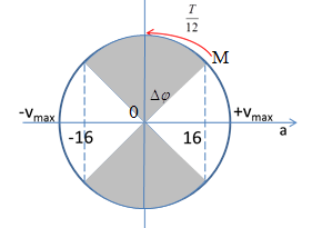 Từ vòng tròn lượng giác, ta có góc quét \(\Delta \varphi  = \omega .\Delta t = \dfrac{{2\pi }}{T}.\dfrac{T}{{12}} = \dfrac{\pi }{6}rad\)