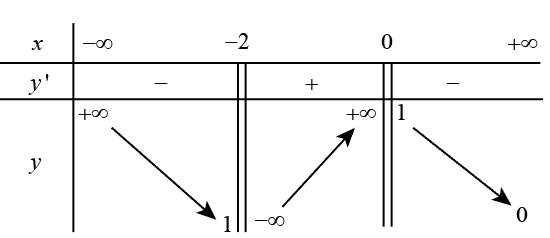 \(\mathop {\lim }\limits_{x \to – {2^ + }} y = + \infty \Rightarrow x = – 2\) là một tiệm cận đứng của đồ thị hàm số.