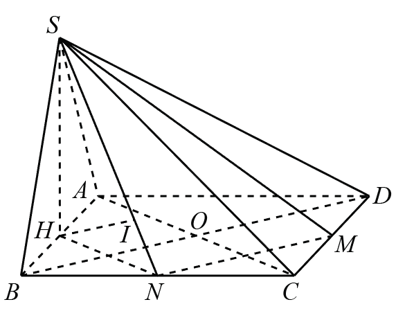 Gọi \(N\) là trung điểm \(BC \Rightarrow MN\,{\rm{//}}\,BD \Rightarrow {d_{\left( {SM,BD} \right)}} = {d_{\left( {BD,\left( {SMN} \right)} \right)}} = {d_{\left( {O,\left( {SMN} \right)} \right)}} = \frac{1}{3}{d_{\left( {A,\left( {SMN} \right)} \right)}} = \frac{1}{2}{d_{\left( {H,\left( {SMN} \right)} \right)}}.\)