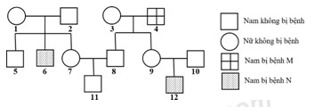 Câu 120. Phả hệ ở hình bên mô tả sự di truyền của bệnh M và bệnh N ở người, mỗi bệnh đều do 1 trong 2 alen của một gen quy định. Cả hai gen này đều nằm ở vùng không tương đồng trên nhiêm sắc thể giới tính X. Biết rằng không xảy ra đột biến và không có hoán vị gen. Theo lí thuyết, có bao nhiêu phát biểu sau đây đúng?