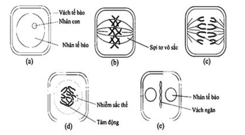 a) tế bào ban đầu; d) kì đầu; b) kì giữa; c) kì sau; e) kì cuối.