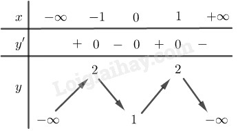 \(\begin{array}{l}y’ = \left\{ \begin{array}{l}3{x^2} – 6x,x \ge 0\\ – 3{x^2} – 6x,x < 0\end{array} \right.\\y’ = 0 \Leftrightarrow \left[ \begin{array}{l}x = 0\\x = 2\\x = – 2\end{array} \right.\end{array}\)