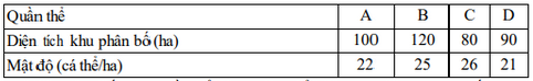 Giải sử 4 quần thể của một loài thú được kí hiệu là A, B, C, D có diện tích khu phân bố và mật độ cá thể như sau