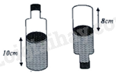 Câu 5: Một cái chai có chứa một lượng nước, phần chứa nước là hình trụ có chiều cao \(10\;{\rm{cm}}\), khi lật ngược chai lại thì phần không chứa nước cũng là một hình trụ có chiều cao \(8\;{\rm{cm}}\) (như hình vẽ bên). Biết thể tích của chai là \(450\pi {\rm{c}}{{\rm{m}}^3}\). Tính bán kính của đáy chai (giả sử độ dày của thành chai và đáy chai không đáng kể).