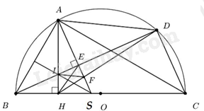 Câu 4: Cho nửa đuờng tròn tâm \(O\), đuờng kính BC. Trên nửa đường tròn (O) lấy A (A khác B và \(C\)), gọi \(H\) là hình chiếu của \(A\) trên B C. Trên cung AC của nửa đường tròn (O) lấy điểm D (D khác \(A\) và \(C\)), gọi \(E\) là hình chiếu của \(A\) trên BD, I là giao điểm của hai đường thằng AH và BD.