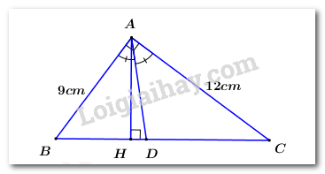 Áp dụng định lí đường phân giác ta có: \(\dfrac{{DB}}{{DC}} = \dfrac{{AB}}{{AC}} = \dfrac{9}{{12}} = \dfrac{3}{4}\).