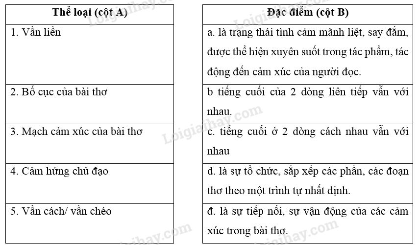 Nối khái niệm ở cột A với đặc điểm tương ứng ở cột B:
