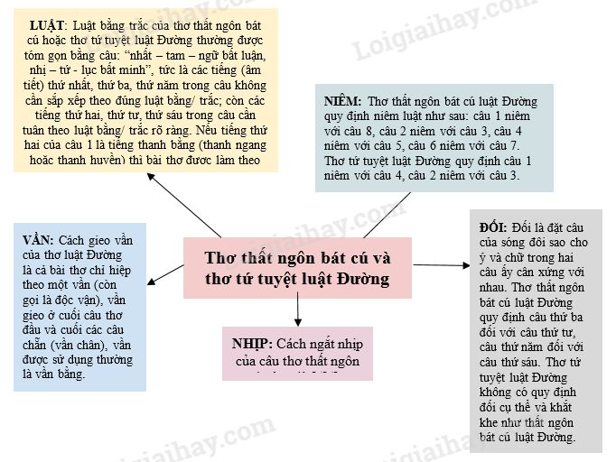 Vẽ sơ đồ tóm tắt luật, niêm, vần, nhịp, đối của thơ thất ngôn bát cú và thơ tứ tuyệt luật Đường.