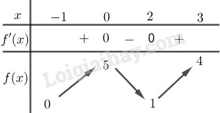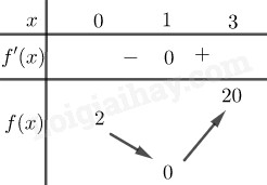 Bước 2: Giải phương trình \(y’ = 0\) tìm nghiệm \(x \in \left[ {0;3} \right]\). Tính giá trị của hàm số tại các nghiệm vừa tìm được và f(0), f(3).