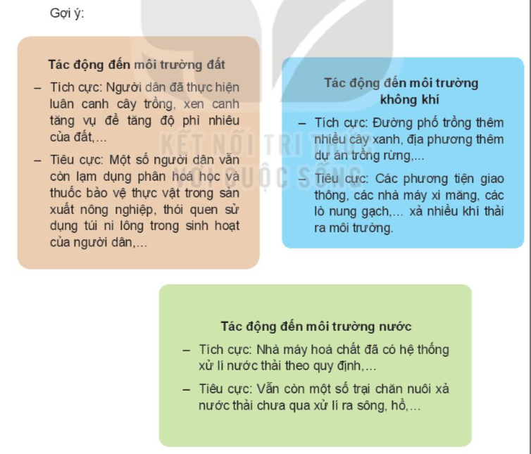 + Tiêu cực: một số người dân vẫn còn lạm dụng phân hóa học và thuốc bảo vệ thực vật trong sản xuất nông nghiệp, thói quen sử dụng túi ni lông trong sinh hoạt của người dân,….