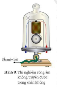 Đặt một chuông điện trong một bình thủy tinh kín (hình 8). Cho chuông điện kêu rồi dùng máy bơm hút dần không khí ra khỏi bình. Khi không khí trong bình càng ít, tiếng chuông nghe được càng nhỏ. Đến khi trong bình gần như hết không khí, cũng gần như không nghe được tiếng chuông nữa. Sau đó, nếu cho không khí vào bình, bạn lại nghe được tiếng chuông.