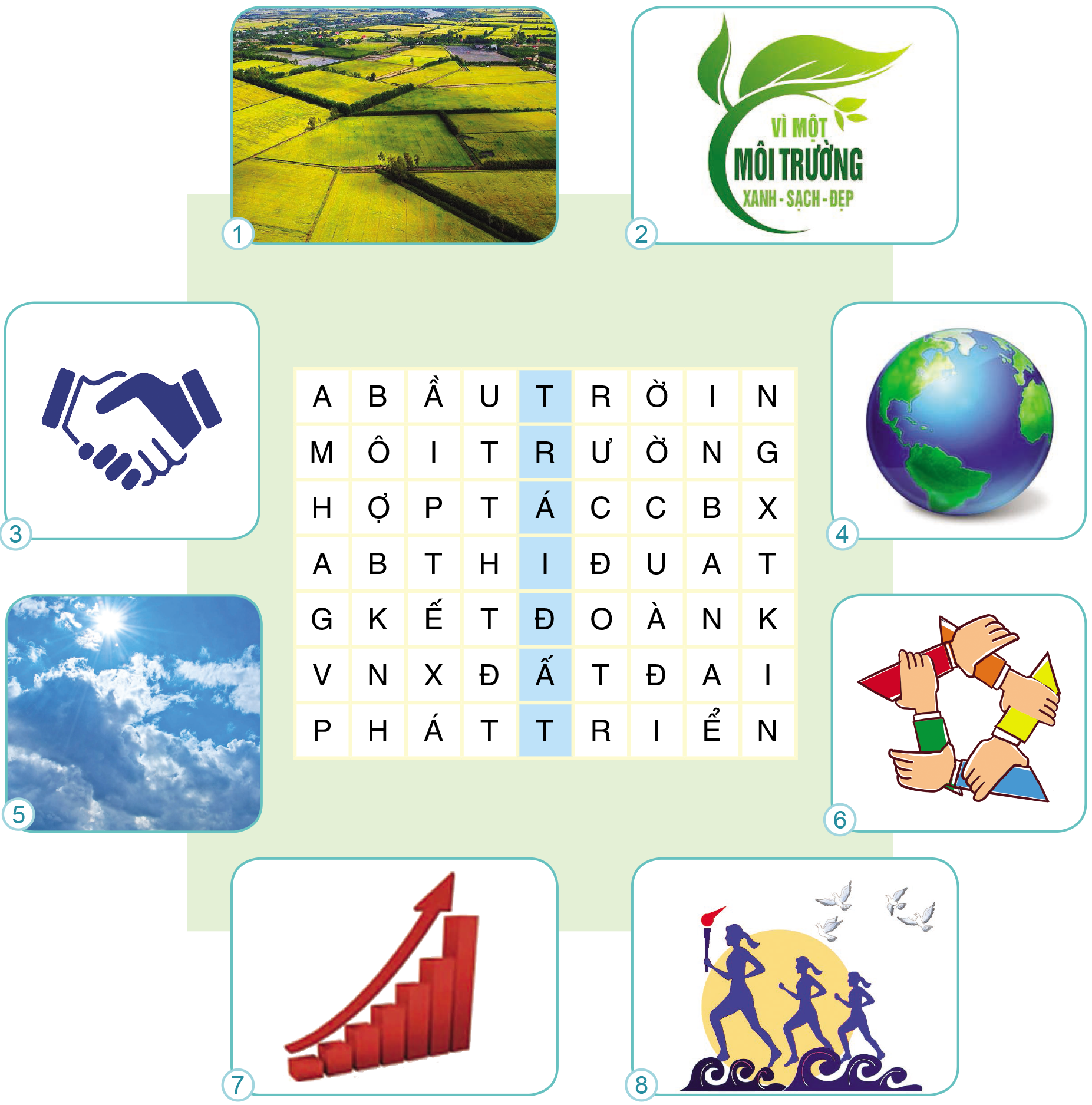 Câu 2: Chọn một từ em vừa tìm được ở ô chữ. Cho biết từ đó được thể hiện ở hình ảnh nào xung quanh ô chữ.