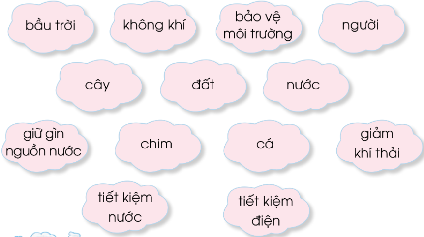 c) Những việc cần làm vì môi trường: bảo vệ môi trường, giữ gìn nguồn nước, giảm khí thải, tiết kiệm nước, tiết kiệm điện.
