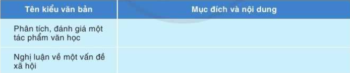 Đề bài: Chỉ ra điểm giống nhau và khác nhau về yêu cầu viết (mục đích và nội dung) của bài nghị luận Phân tích, đánh giá một tác phẩm văn học và Nghị luận về một vấn đề xã hội đã học. Hoàn thành yêu cầu của bài tập vào vở theo bảng sau: