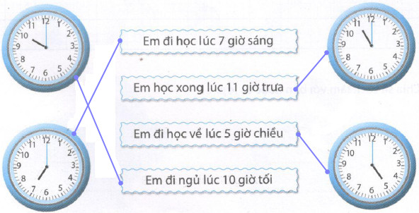 Đọc giờ đồng hồ đang chỉ và  buổi (sáng, trưa, chiều, tối) tương ứng.