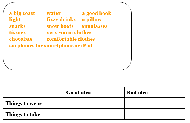 (Thảo luận ý kiến nào dưới đây là tốt và ý kiến nào là không tốt cho một hành trình xe buýt dài. Đưa ra lý do. Sau đó hoàn thành bảng.)
