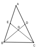 Suy ra \(BG = \dfrac{2}{3}BD;\,CG = \dfrac{2}{3}CE\) mà \(BD = CE \Rightarrow \)\(BG = CG.\) Từ đó \(BD – BG = CE – CG \Rightarrow GD = GE\)