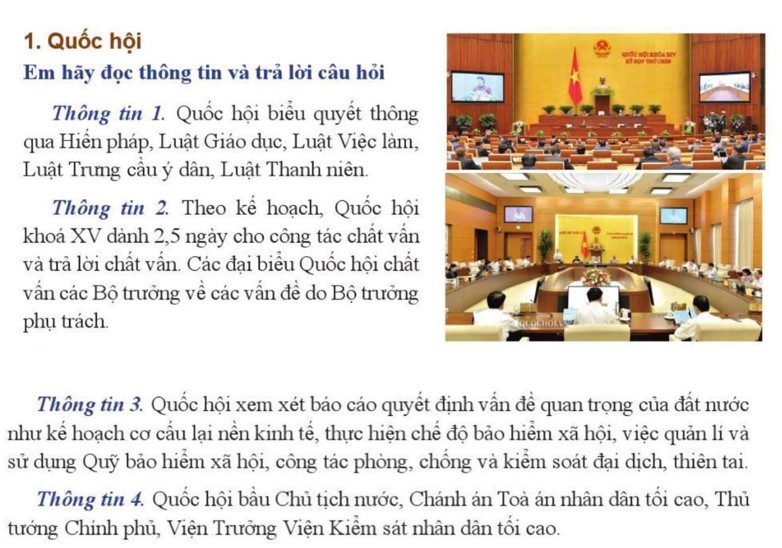 a) Thông tin 1 cho thấy Quốc hội có nhiệm vụ quan trọng trong ban hành văn bản luật: biểu quyết thông qua Hiến pháp, Luật Giáo dục, Luật Việc làm, Luật Trưng cầu ý dân, Luật Thanh niên.