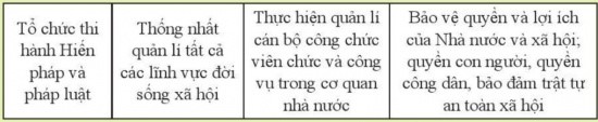 Thống nhất quản lí nhà nước về các lĩnh vực trong xã hội; thống nhất quản lí nền hành chính quốc gia; thực hiện quản lí nhà nước về cán bộ, công chức, viên chức và công vụ trong các cơ quan nhà nước; lãnh đạo công tác của các bộ, cơ quan ngang bộ, cơ quan thuộc Chính phủ, Uỷ ban nhân dân các cấp.
