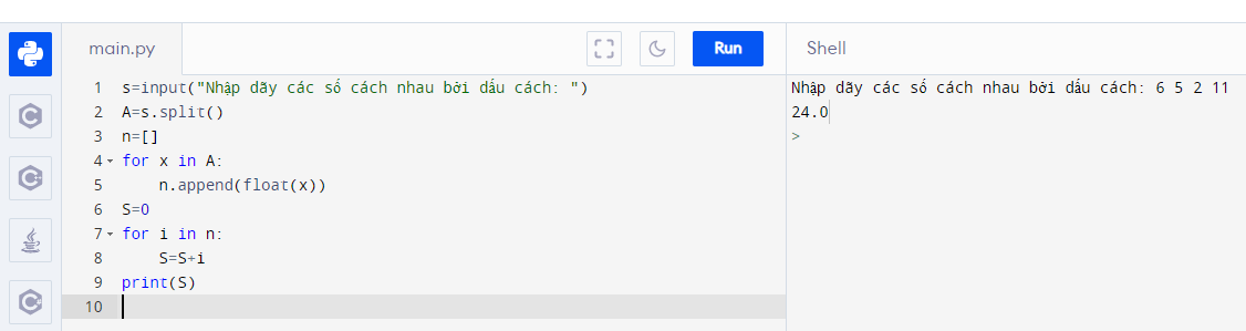 1. Viết chương trình nhập nhiều số (số nguyên hoặc số thực) từ bàn phím, các số cách nhau bởi dấu cách. Sau đó in ra màn hình tổng các số đã nhập.