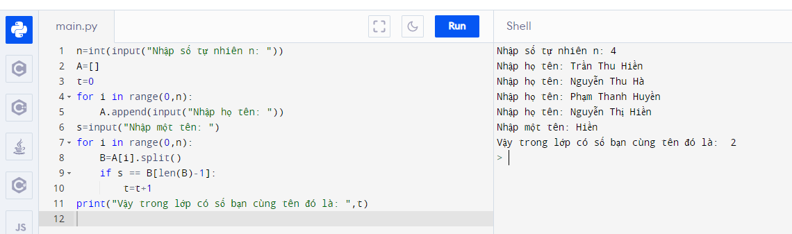 print(“Vậy trong lớp có số bạn cùng tên đó là: “,t)