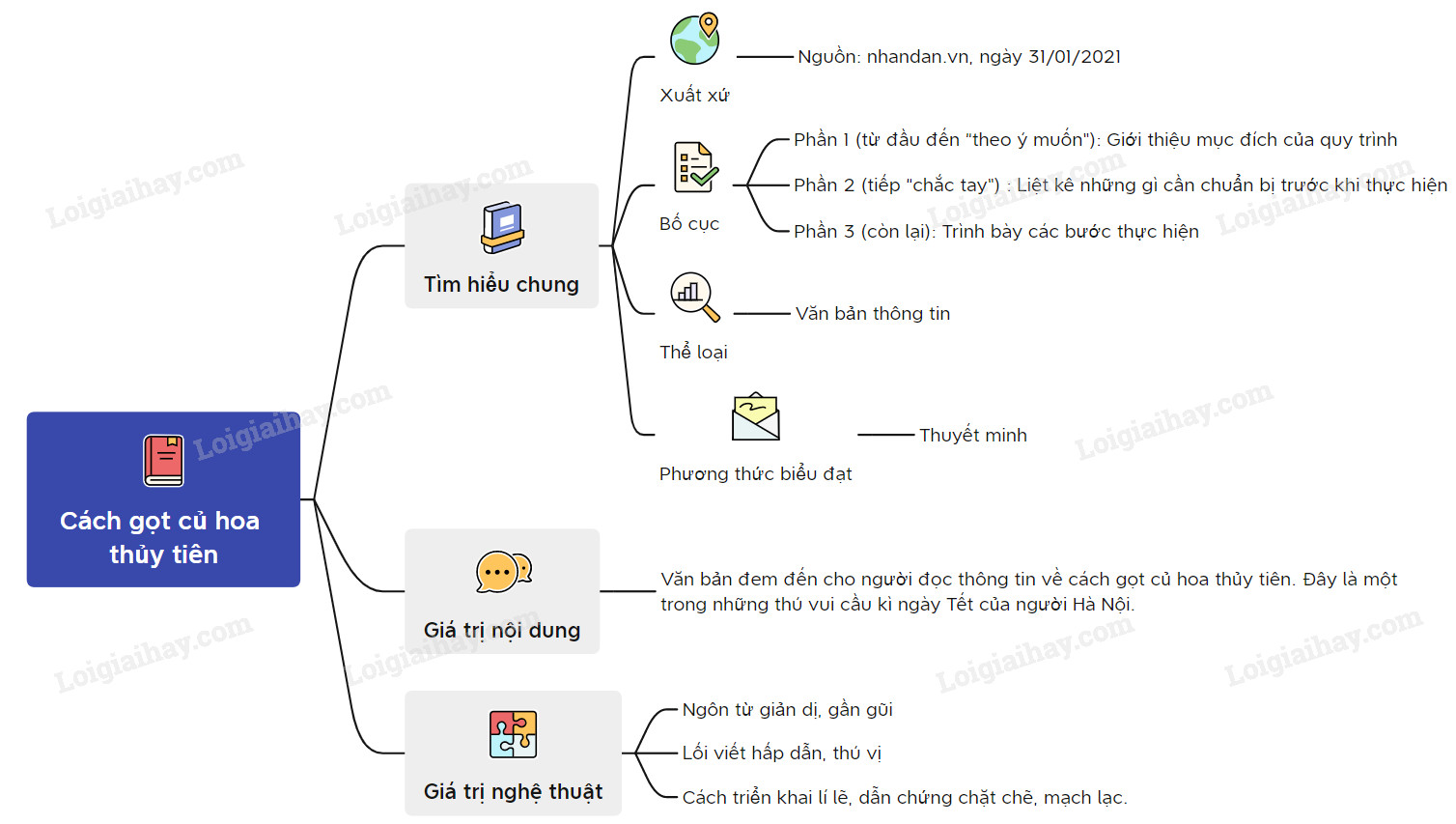 Sơ đồ tư duy văn bản Cách gọt củ hoa thủy tiên: